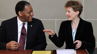 Federal councillor Simonetta Sommaruga and Nigerian exterior minister Henry Odein Ajumogobia signing a memorandum of understanding concerning the migration partnership between Nigeria and Switzerland. Bern, February 14, 2011.